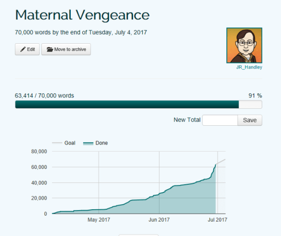 written more, but I lost 4 hours planning and outlining the final battle of the novel. Overall, I’m pleased with how I did and I found the experience to be earth shattering. I know I’m capable of writing more words than I thought I was, and I realize how crucial outlining is to my process. Oh, and I recognized how much I let myself get distracted by the parts of the writing business that don’t equal more books on the market. Glad my wife and mother insisted I do this! And I forgot to mention that I ended up pushing my approximate ending word count to 80K, where it started. I made that decision because I’ve about 10 chapters left, and am 600 words from the 70K goal. One positive thing about that change was that seeing the percentage jump helped trick my mind. I plan on using the gamification of the process to my advantage, make my nature work for me and so I don’t get bummed out.