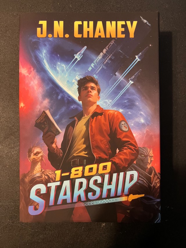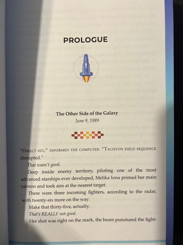 Finally, I received an awesome hardcover copy of the book. I read the ebook, but a signed physical copy is a cool shelf trophy that I’ll proudly throw this one onto my bookshelf. The art is stunning, the typesetting is top notch, and the in-book art was fun. There is a small spaceship at the bottom of the page that moves across the page as you read it. If I wasn’t worried about ruining the book, I’d flip the pages like we did as kids to watch it move quicker! Still curious, then let me share the blurb of this novel!
